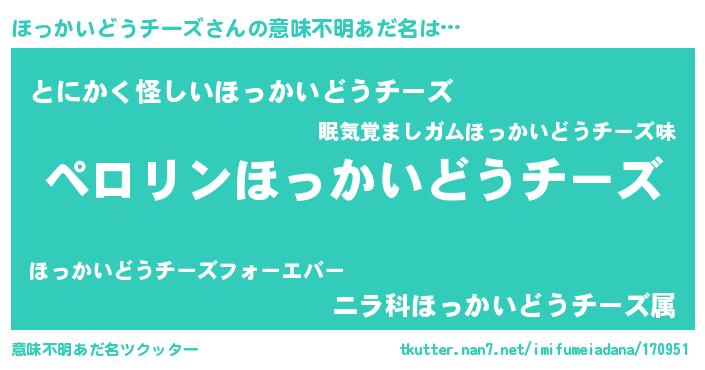 | 男性向けラノベタイトル風あだ名 | 『ホッカイドウチーズアートオンライン』 |