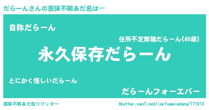 | 男性向けラノベタイトル風あだ名 | 『だらーんという概念が存在しない退屈な世界 』 |