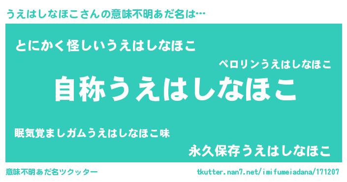 | 男性向けラノベタイトル風あだ名 | 『Re:うえはしなほこから始める異世界生活』 |