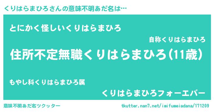 | 男性向けラノベタイトル風あだ名 | 『魔弾の王とくりはらまひろ』 |