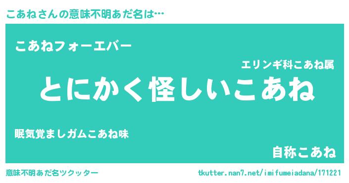| 男性向けラノベタイトル風あだ名 | 『こあねの嫁は女の子じゃないと思った?』 |