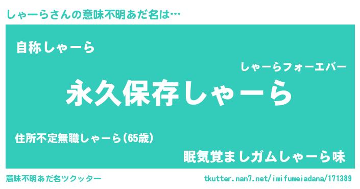| 女子向けラノベタイトル風あだ名 | 『異世界で失敗しない100のしゃーら』 |