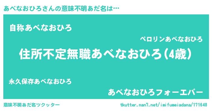 | 男性向けラノベタイトル風あだ名 | 『魔弾の王とあべなおひろ』 |
