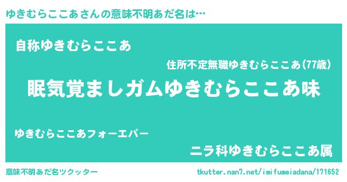 | 男性向けラノベタイトル風あだ名 | 『おまえをオタクにしてやるから、俺をゆきむらここあにしてくれ! 』 |