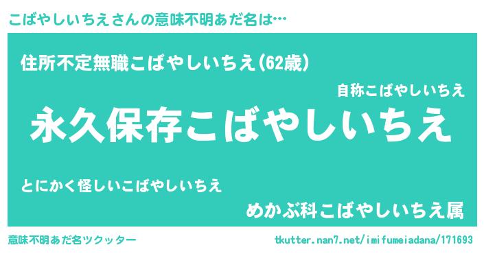 | 胡散臭い通販商品みたいなあだ名 | 『絶対に幸福をもたらす水素水…その名も「こばやしいちえ」』 |