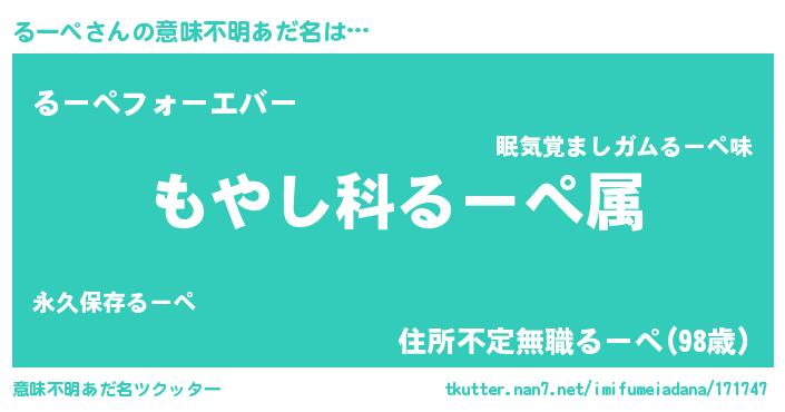 | 男性向けラノベタイトル風あだ名 | 『転生したらるーぺだった件』 |