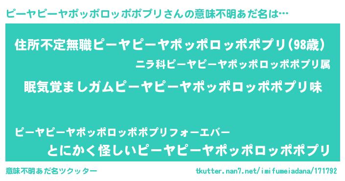 | 男性向けラノベタイトル風あだ名 | 『うちのピーヤピーヤポッポロッポポプリが世界を掌握している!』 |