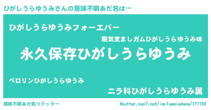 | 男性向けラノベタイトル風あだ名 | 『ひがしうらゆうみという概念が存在しない退屈な世界 』 |