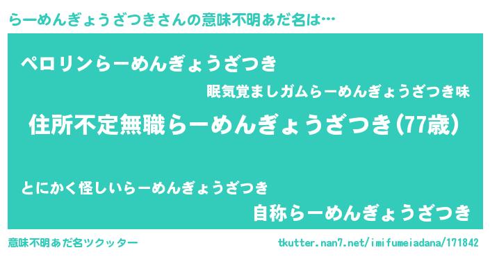 | 男性向けラノベタイトル風あだ名 | 『この素晴らしい世界にらーめんぎょうざつきを!』 |