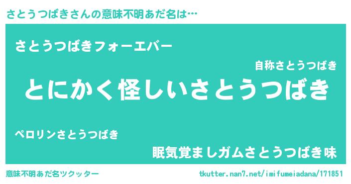 | 男性向けラノベタイトル風あだ名 | 『さとうつばきの嫁は女の子じゃないと思った?』 |