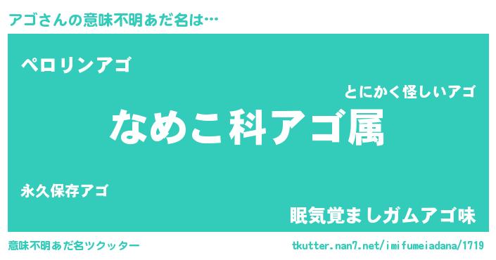 | ピコ太郎風あだ名 | 『アコ四郎』『アア太郎』『アゴ六郎』 |