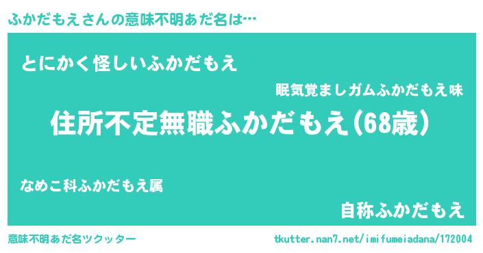| 男性向けラノベタイトル風あだ名 | 『この素晴らしい世界にふかだもえを!』 |