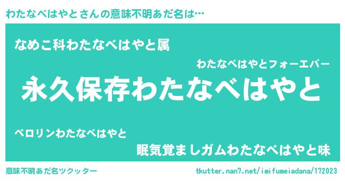| 胡散臭い通販商品みたいなあだ名 | 『来世でも幸せになれる健康食品…その名も「わたなべはやと」』 |