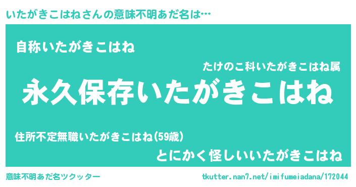 | 男性向けラノベタイトル風あだ名 | 『いたがきこはねに滅ぼされるだけの簡単なお仕事です』 |