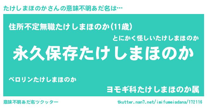 | ヘコむあだ名 | 『たけしまほのか(遠い目)』『たけを』 |