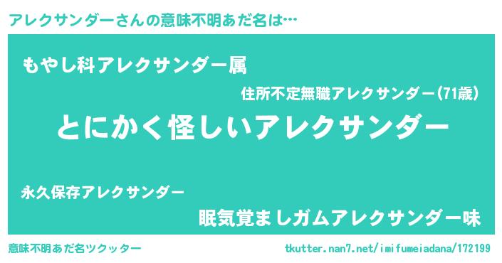 | 男性向けラノベタイトル風あだ名 | 『アレクサンダーに滅ぼされるだけの簡単なお仕事です』 |