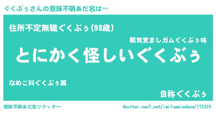 | 女子向けラノベタイトル風あだ名 | 『ぐくぶぅの卵を拾いまして』 |