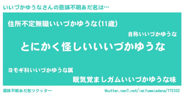 | 男性向けラノベタイトル風あだ名 | 『いいづかゆうなの嫁は女の子じゃないと思った?』 |