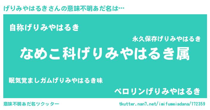| 男性向けラノベタイトル風あだ名 | 『転生したらげりみやはるきだった件』 |
