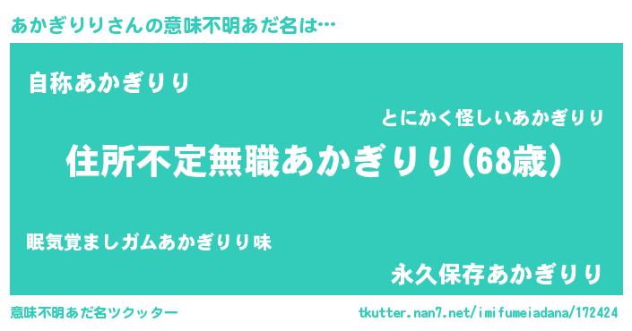| 女子向けラノベタイトル風あだ名 | 『あかぎりりが死なない童話 林檎のあかぎりりの診療簿』 |