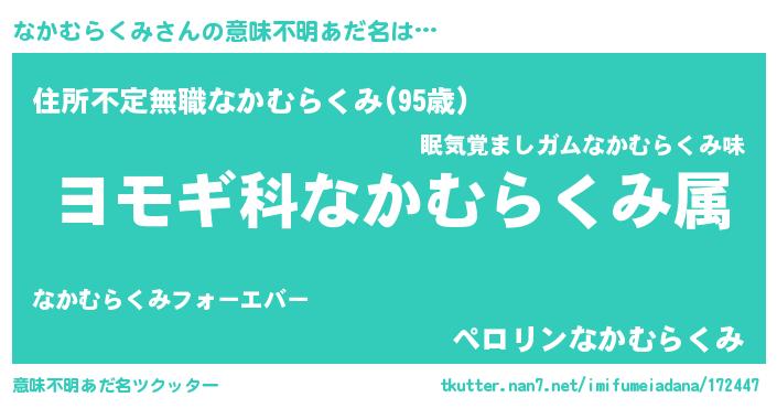 | 男性向けラノベタイトル風あだ名 | 『なかむらくみ~年齢イコール彼女いない歴の魔法使い~』 |