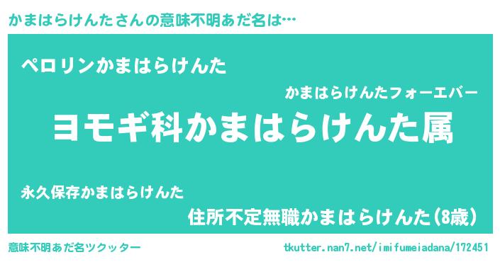 | 男性向けラノベタイトル風あだ名 | 『うちのかまはらけんたが世界を掌握している!』 |
