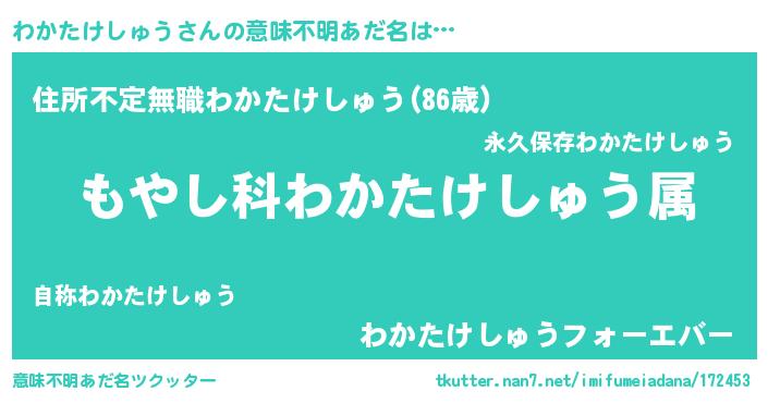 | 男性向けラノベタイトル風あだ名 | 『転生したらわかたけしゅうだった件』 |