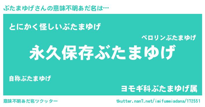 | 男性向けラノベタイトル風あだ名 | 『ぶたまゆげという概念が存在しない退屈な世界 』 |