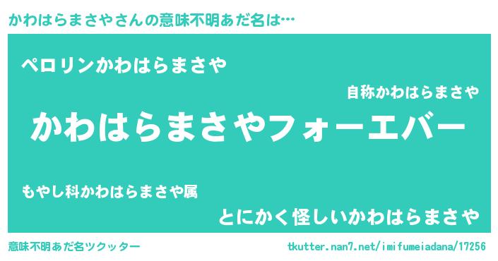 | 男性向けラノベタイトル風あだ名 | 『うちのかわはらまさやが世界を掌握している!』 |