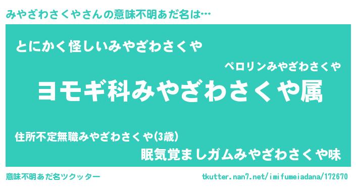 | 男性向けラノベタイトル風あだ名 | 『みやざわさくや~年齢イコール彼女いない歴の魔法使い~』 |
