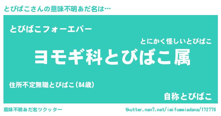 | 男性向けラノベタイトル風あだ名 | 『とびばこ~年齢イコール彼女いない歴の魔法使い~』 |