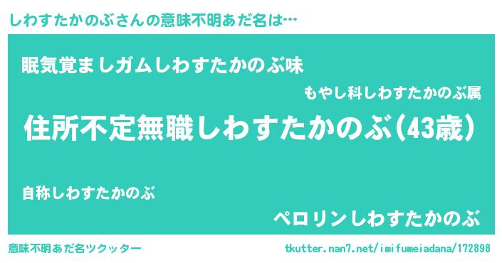 | 男性向けラノベタイトル風あだ名 | 『この素晴らしい世界にしわすたかのぶを!』 |