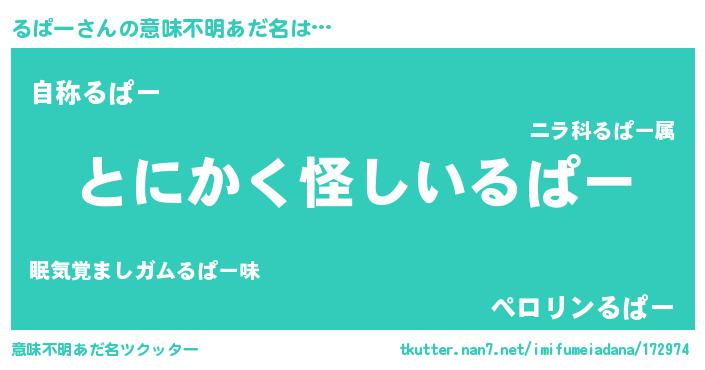 | 男性向けラノベタイトル風あだ名 | 『るぱーの嫁は女の子じゃないと思った?』 |