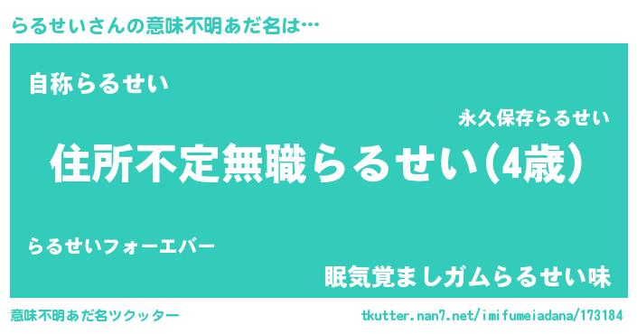 | ヘコむあだ名 | 『らるせい(小並感)』『酢こんぶ』 |