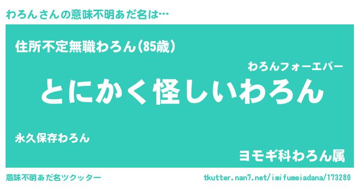 | 男性向けラノベタイトル風あだ名 | 『わろんの嫁は女の子じゃないと思った?』 |