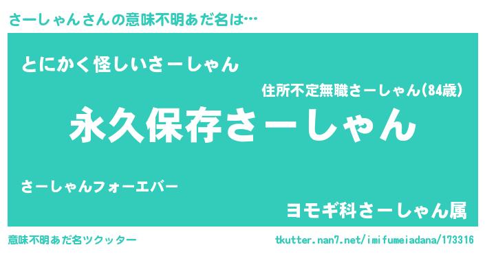 | 男性向けラノベタイトル風あだ名 | 『さーしゃんという概念が存在しない退屈な世界 』 |