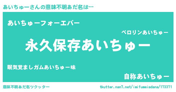 | 男性向けラノベタイトル風あだ名 | 『あいちゅーという概念が存在しない退屈な世界 』 |