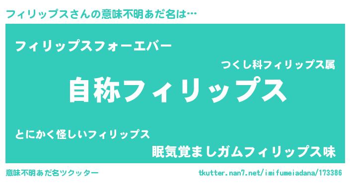 | 男性向けラノベタイトル風あだ名 | 『Re:フィリップスから始める異世界生活』 |
