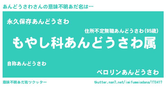 | 男性向けラノベタイトル風あだ名 | 『転生したらあんどうさわだった件』 |
