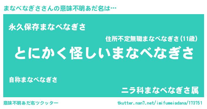| ポケモン風あだ名 | 『ヒマナベナギサ』『ゼニマナ』 |