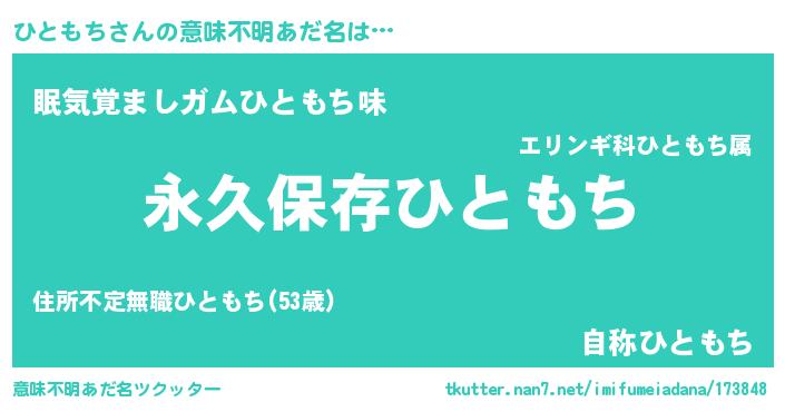| 男性向けラノベタイトル風あだ名 | 『ひともちという概念が存在しない退屈な世界 』 |