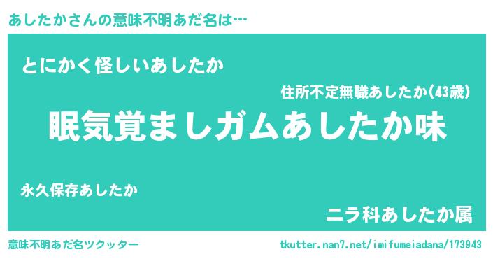 | 男性向けラノベタイトル風あだ名 | 『緋弾のアシタカ』『魔弾の王とあしたか』 |