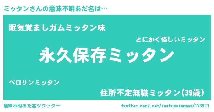 | 女子向けラノベタイトル風あだ名 | 『ミッタンの契約王妃』『ミッタン恋絵巻』 |