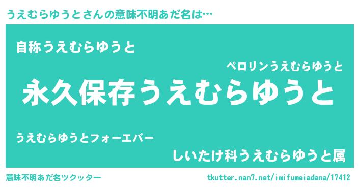 | 男性向けラノベタイトル風あだ名 | 『うえむらゆうとという概念が存在しない退屈な世界 』 |