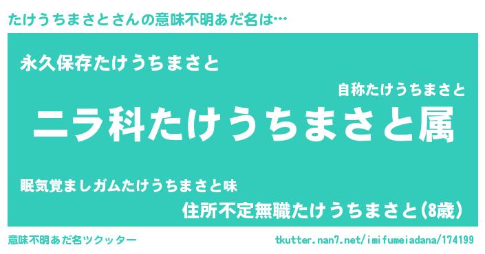 | 男性向けラノベタイトル風あだ名 | 『たけうちまさと~年齢イコール彼女いない歴の魔法使い~』 |