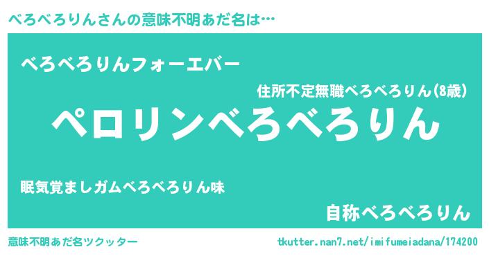 | 女子向けラノベタイトル風あだ名 | 『(仮)べろべろりんのやんごとなき事情』 |