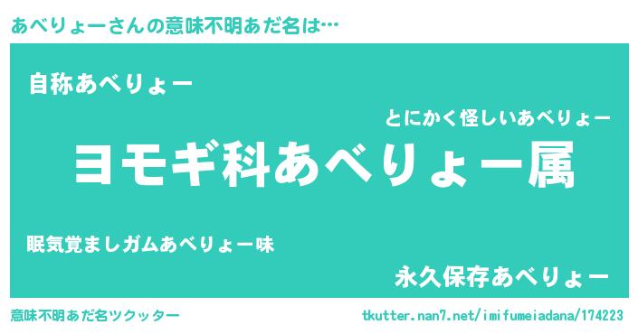 | 男性向けラノベタイトル風あだ名 | 『あべりょー~年齢イコール彼女いない歴の魔法使い~』 |