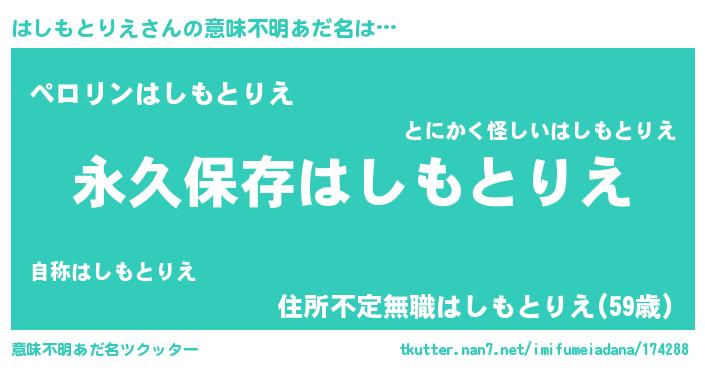 | 胡散臭い通販商品みたいなあだ名 | 『絶対に幸福をもたらす健康食品…その名も「はしもとりえ」』 |