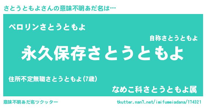 | 胡散臭い通販商品みたいなあだ名 | 『来世でも幸せになれる水素水…その名も「さとうともよ」』 |