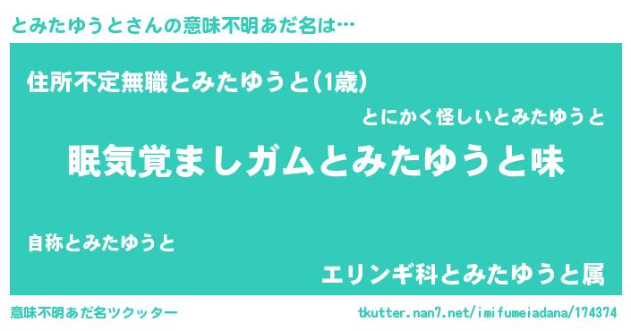 | 男性向けラノベタイトル風あだ名 | 『おまえをオタクにしてやるから、俺をとみたゆうとにしてくれ! 』 |